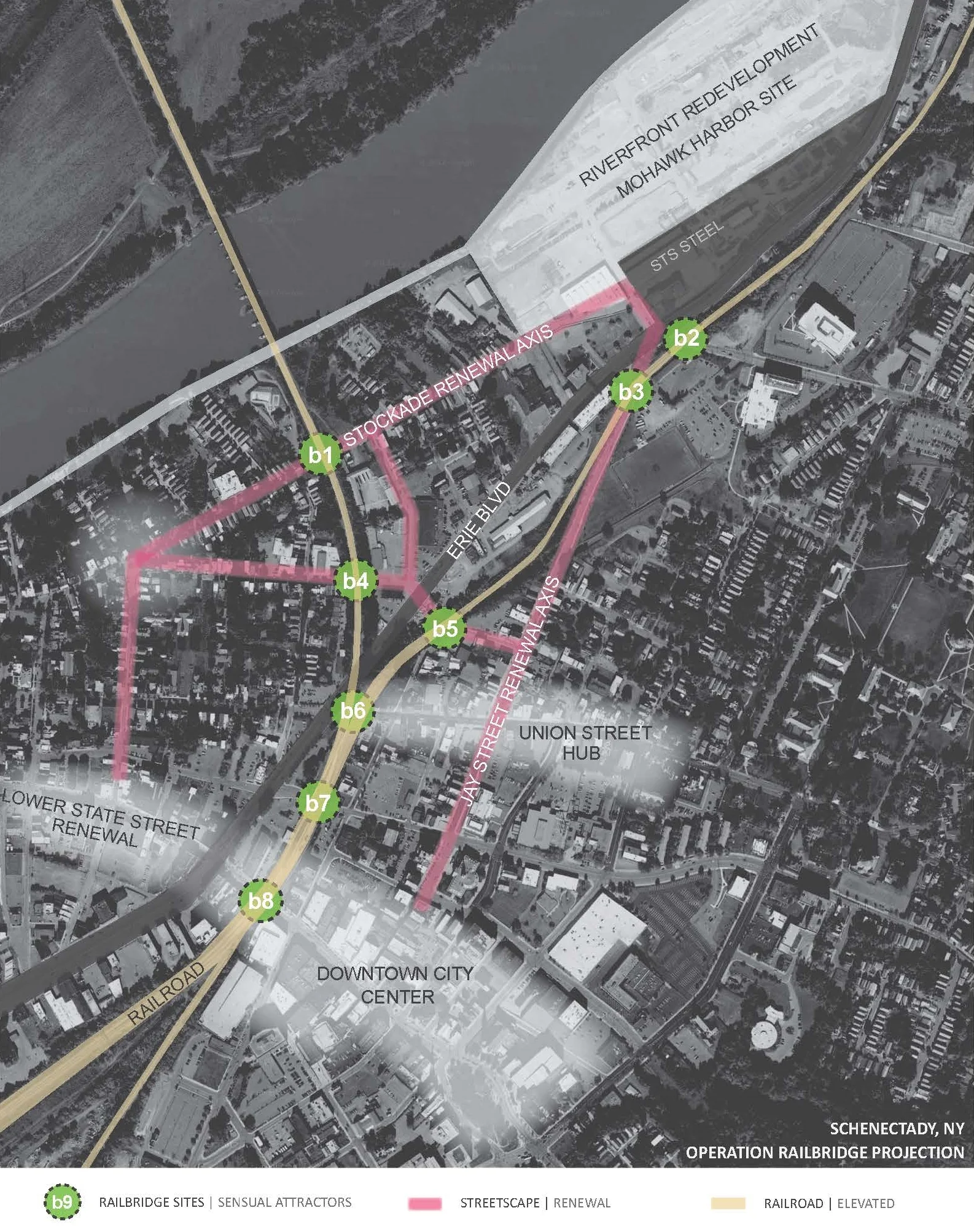 Operation Railbridge is an initiative to revive the nine railway underpasses that recur throughout downtown Schenectady into dynamic public assets. These historic spaces are in various states of disrepair, and currently disconnect adjoining neighborhoods. This project was conceived to creatively address such conditions, connecting the city’s industrial history to an innovative future through the integration of responsive art, design and technology. As a collective, we are agents in reclaiming underutilized public space that will engage artisans, designers and community stakeholders to re-frame historical connections through creative economy.