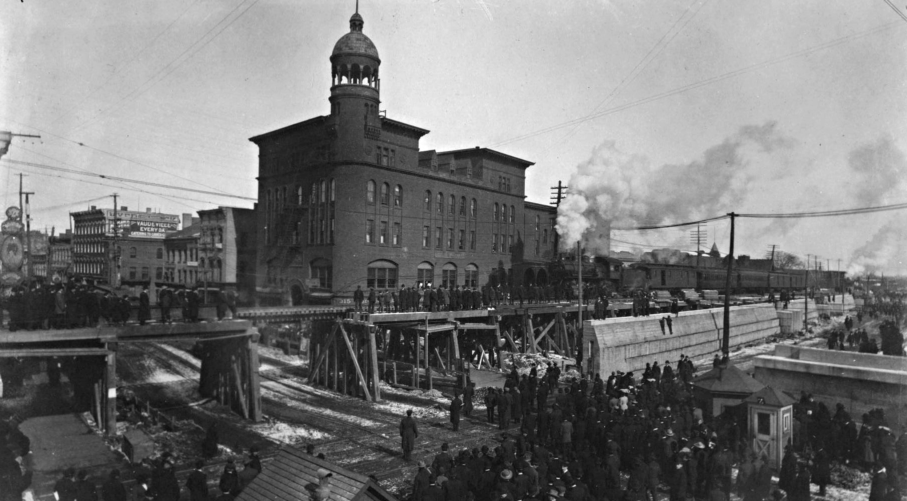 New York Central track elevation under construction, State Street c.1905. Source: SCHS (above)